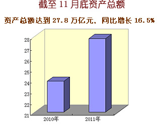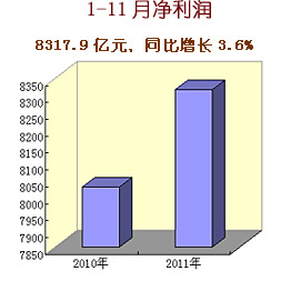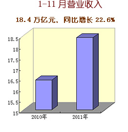 2011年中央企業(yè)認真貫徹落實黨中央、國務院各項決策部署,生產(chǎn)經(jīng)營總體上保持平穩(wěn)較快增長,主要經(jīng)濟指標創(chuàng)歷史新高。1-11月,累計實現(xiàn)營業(yè)收入18.4萬億元,同比增長22.6%;累計實現(xiàn)凈利潤8317.9億元,同比增長3.6%;上交稅金1.52萬億元,同比增長24.8%,增速比營業(yè)收入高2.2個百分點,比凈利潤高21.2個百分點;截至11月底,中央企業(yè)資產(chǎn)總額達到27.8萬億元,同比增長16.5%;凈資產(chǎn)10.5萬億元,同比增長12.8%。