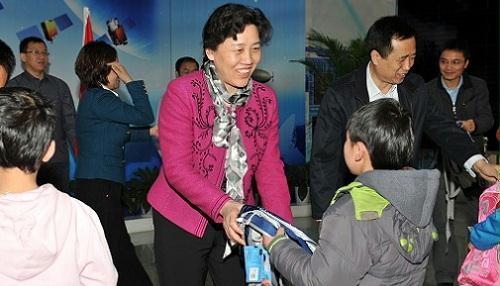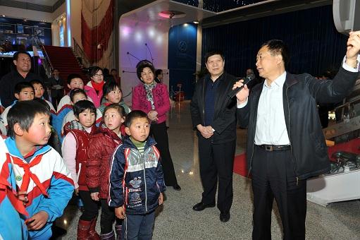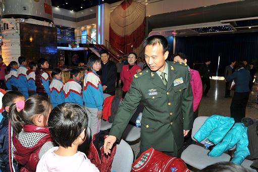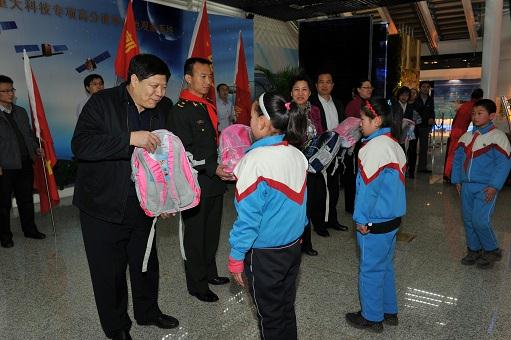 在航天城會展中心展廳,孩子們第一次見到了從前只能在電視里見到的英雄航天員費俊龍。當(dāng)費將軍走進展廳時,孩子們歡呼雀躍,激動的心情寫在紅撲撲的小臉上。孩子們?yōu)橛⑿酆教靻T敬獻紅領(lǐng)巾和莊嚴(yán)的少先隊隊禮,以表達他們對航天員叔叔崇高的敬意和無限的敬仰之情。費將軍與孩子們親切握手,鼓勵孩子們要熱愛黨、熱愛人民、熱愛偉大的祖國,要勇敢、堅強,不怕困難,超越自我,珍惜現(xiàn)在的學(xué)習(xí)條件和所有人的關(guān)心幫助,努力學(xué)習(xí),真正成為中國特色社會主義事業(yè)的合格建設(shè)者和接班人!他在講話中表示,通過這次活動能夠為孩子們獻上自己的愛心,積極履行社會責(zé)任,非常有意義。費將軍還和國資委直屬機關(guān)黨委常務(wù)副書記曾堅、企業(yè)改革局局長白英姿、直屬機關(guān)工會主席呂秋菊以及中國航天科技集團公司五院黨委書記李開民一起,把嶄新的學(xué)習(xí)用品送到孩子們手中。