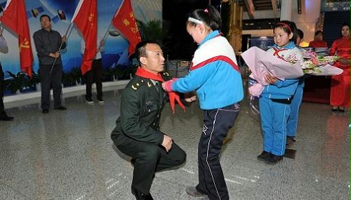 孩子們?yōu)橛⑿酆教靻T費俊龍將軍佩戴紅領(lǐng)巾