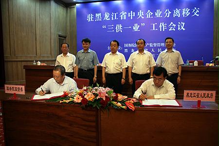 為推進中央企業(yè)分離辦社會職能,做好駐黑央企分離移交“三供一業(yè)”(供水、供電、供熱和物業(yè)管理)工作,6月28日上午,國務(wù)院國資委與黑龍江省人民政府在哈爾濱共同召開駐黑龍江省中央企業(yè)分離移交“三供一業(yè)”工作會議。國務(wù)院國資委副主任、黨委副書記邵寧和黑龍江省人民政府副省長張建星出席會議并講話。黑龍江省政協(xié)黨組副書記、省國資委黨委書記趙克非和國務(wù)院國資委副秘書長郭建新出席了會議。會議由黑龍江省人民政府省長助理、省國資委主任趙杰主持。會上,哈爾濱市政府介紹了分離移交“三供一業(yè)”有關(guān)政策及經(jīng)驗;哈電集團、中航工業(yè)東安公司、兵器工業(yè)集團、國家電網(wǎng)代表有關(guān)中央企業(yè)作了發(fā)言;國務(wù)院國資委與黑龍江省人民政府簽署了《關(guān)于駐黑龍江省中央企業(yè)分離移交“三供一業(yè)”工作協(xié)議》,有關(guān)企業(yè)與接收單位簽訂了《分離移交協(xié)議》。