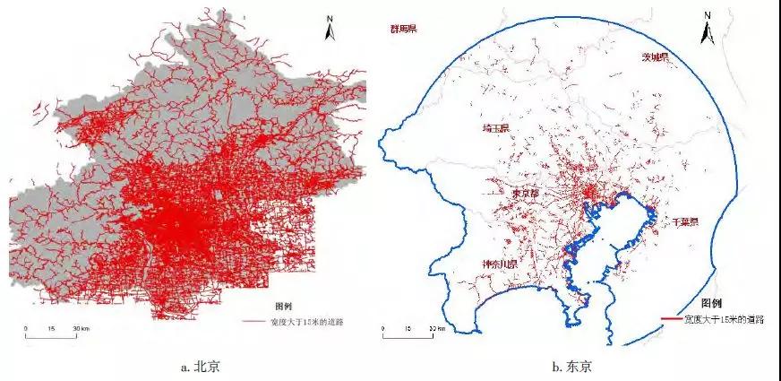 圖4  北京與東京道路寬度大于15m的空間分布圖[3]
