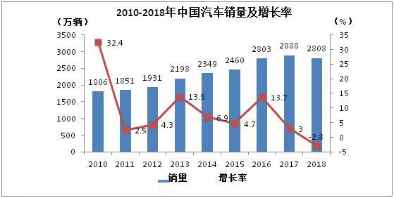 進入新世紀(jì)以來,中國汽車保有量逐年增加,市場規(guī)模持續(xù)擴大,年銷量由2001年的237萬輛持續(xù)增長至2009年的1364萬輛,年均增速達(dá)24%,汽車產(chǎn)業(yè)首次位居世界第一。2010年至2017年,全國汽車銷量仍持續(xù)增長,由年銷售1806萬輛增至2888萬輛,但增速明顯放緩,年均增速約7%。2018年全年銷量2808萬輛如圖1,雖實現(xiàn)了連續(xù)10年領(lǐng)跑全球,但在連續(xù)增長近30年后第一次經(jīng)歷了下滑,2019年前5個月銷量仍不如2018年,行業(yè)開始理性回歸。