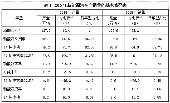 2018年我國新能源汽車產(chǎn)銷量如表1所示,全年累計產(chǎn)量為127萬輛、年銷量為125.6萬輛,占全部汽車銷量的4.5%,比2017年同期增長61.7%。其中,新能源乘用車全年累計銷售量為105.3萬輛,純電動車占據(jù)了約75%的份額;新能源客車和貨車的銷售量幾乎全部來自于純電動車。