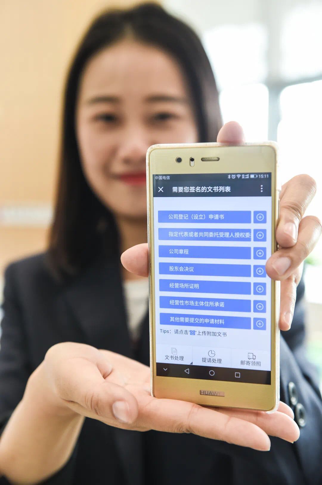 圖5 南京棲霞區(qū)商事登記服務(wù)大廳工作人員展示以微信公眾號為平臺的“不見面審批”系統(tǒng)