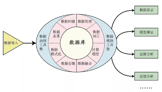WEB服務(wù)器中需要配置保證網(wǎng)絡(luò)正常運(yùn)行的各種服務(wù),除此之外,最重要的是集中布置全生命周期數(shù)字平臺(tái)的功能模塊集。功能模塊集主要包括對(duì)入庫(kù)數(shù)據(jù)進(jìn)行治理的數(shù)據(jù)治理工具集以及使數(shù)據(jù)生命化的數(shù)據(jù)模塊工具集。數(shù)據(jù)治理工具集主要包括數(shù)據(jù)糾錯(cuò)模塊、數(shù)據(jù)去重模塊、數(shù)據(jù)格式化模塊、數(shù)據(jù)存取模塊等,實(shí)現(xiàn)的功能是要嚴(yán)格保證入庫(kù)數(shù)據(jù)的質(zhì)量及精度,作為數(shù)據(jù)后續(xù)衍生復(fù)用的基礎(chǔ)。數(shù)據(jù)模塊工具集主要包括數(shù)據(jù)處理、數(shù)據(jù)加工、數(shù)據(jù)融合、計(jì)算模型等模塊,其功能主要在數(shù)據(jù)庫(kù)中元數(shù)據(jù)的基礎(chǔ)上,挖掘數(shù)據(jù)內(nèi)在聯(lián)系,派生新的數(shù)據(jù),最后通過(guò)數(shù)據(jù)顯示、模型展示等方式傳遞給前端用戶,基本布局原理如圖2所示。
