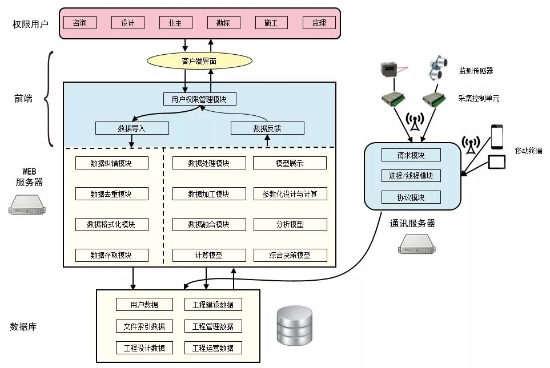 通訊服務(wù)器用來(lái)將工程布置的傳感器監(jiān)測(cè)數(shù)據(jù)、用戶外圍通訊設(shè)備等采集的工程一線數(shù)據(jù),實(shí)時(shí)準(zhǔn)確的傳遞到工程數(shù)據(jù)庫(kù)中,以保證工程各方人員能夠第一時(shí)間在數(shù)字平臺(tái)上看到工程的當(dāng)前狀態(tài)。服務(wù)器與移動(dòng)網(wǎng)絡(luò)連接,將指令發(fā)送到采集控制單元,并取回傳感器信號(hào)??刂葡到y(tǒng)可視情況集成在WEB服務(wù)器上或通訊服務(wù)上,用戶可以通過(guò)操作控制系統(tǒng),配置傳感器單元,發(fā)出指令采集工程數(shù)據(jù)。
