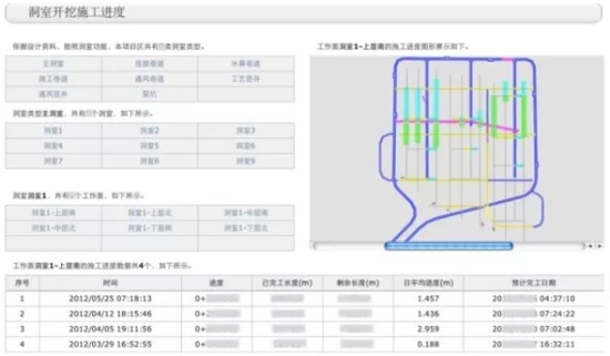 經(jīng)過(guò)高度提煉后的元數(shù)據(jù)具有數(shù)據(jù)存儲(chǔ)量少而精的優(yōu)勢(shì),經(jīng)過(guò)數(shù)據(jù)模塊工具集中不同模塊的單獨(dú)加工或聯(lián)合加工,可以派生出眾多有價(jià)值的信息,通過(guò)不同角度展示給所需用戶,供其做出綜合決策判識(shí)。如工程中的進(jìn)度信息采集導(dǎo)入平臺(tái)后,可以實(shí)時(shí)展示出洞室三維施工進(jìn)度形象,經(jīng)過(guò)數(shù)據(jù)模塊加工后可以根據(jù)當(dāng)前施工進(jìn)度計(jì)算出當(dāng)前施工速度,并可預(yù)測(cè)出未來(lái)的施工完成時(shí)間等,如圖11所示。