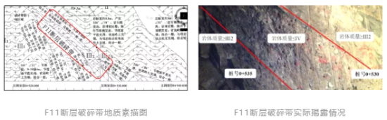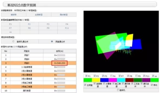將施工進(jìn)度預(yù)測(cè)模塊與斷層預(yù)測(cè)模塊聯(lián)合使用,可精確預(yù)測(cè)出洞室開(kāi)挖前方遭遇斷層的位置與時(shí)間,及時(shí)提醒工程人員應(yīng)對(duì)即將到來(lái)的特殊地質(zhì)情況,提前做好圍巖補(bǔ)強(qiáng)加固或其他應(yīng)對(duì)措施。例如在9號(hào)洞室施工時(shí),平臺(tái)預(yù)測(cè)出在開(kāi)挖面前方0+540.253位置有F11斷層經(jīng)過(guò)(圖12),及時(shí)進(jìn)行了研究部署,決定在開(kāi)挖揭露出斷層后,立即采取圍巖補(bǔ)強(qiáng)注漿的方式對(duì)巖體進(jìn)行加固。