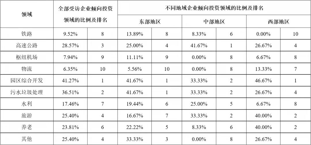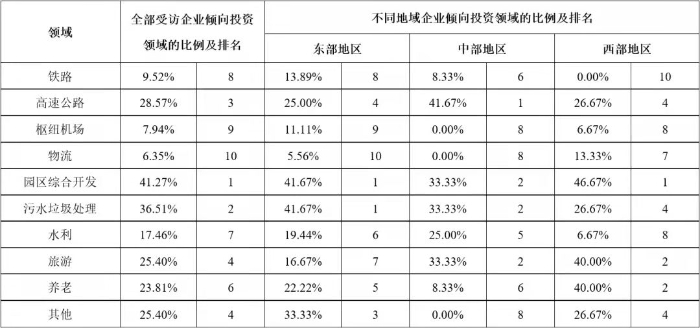 東部地區(qū)企業(yè)偏好投資的領(lǐng)域排序與平均水平比較相似,對(duì)園區(qū)綜合開發(fā)、污水垃圾處理、高速公路等領(lǐng)域投資傾向較強(qiáng)。