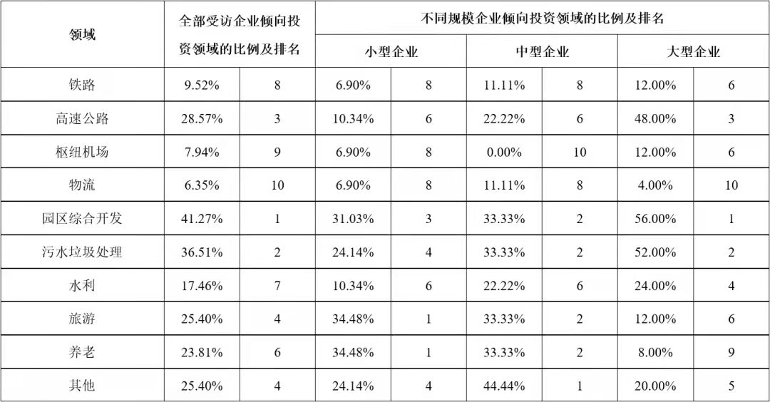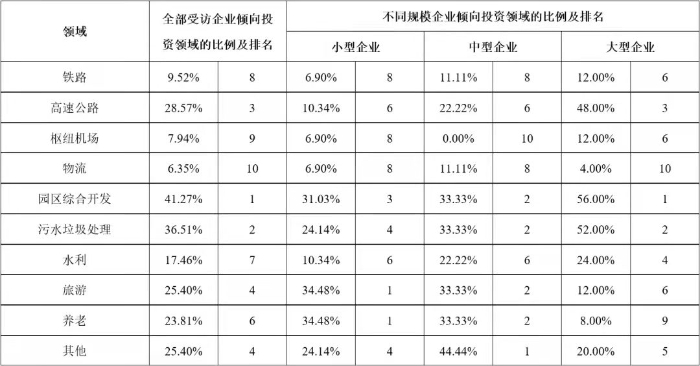 大型企業(yè)傾向投資的領(lǐng)域包括園區(qū)綜合開發(fā)、污水垃圾處理、高速公路,比例顯著高于企業(yè)整體水平。此外,水利行業(yè)雖不算熱門行業(yè),但大型企業(yè)對(duì)其投資傾向高于整體水平。與之相反,大型企業(yè)對(duì)旅游、養(yǎng)老的投資熱情不高。
