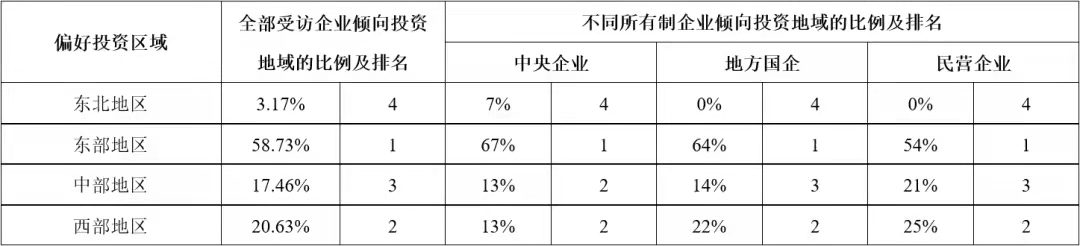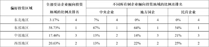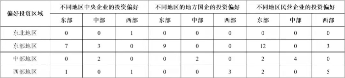 中央企業(yè)、地方國(guó)企、民營(yíng)企業(yè)等不同所有制類型的企業(yè)對(duì)投資區(qū)域的偏好存在差異,調(diào)研結(jié)果統(tǒng)計(jì)如表4所示。