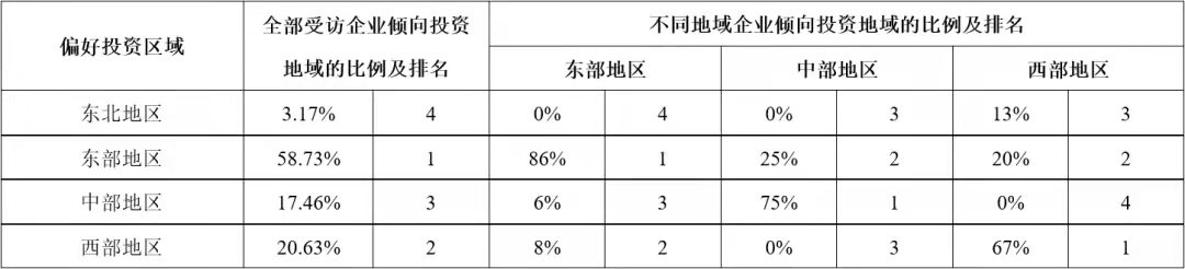 分析表中數(shù)據(jù)可以明顯看出,無論是哪個(gè)地區(qū)的企業(yè),投資地域偏好最高的均為企業(yè)所在地區(qū),企業(yè)的地域投資偏好與企業(yè)業(yè)務(wù)常駐地高度相關(guān)。值得注意的是,各區(qū)域企業(yè)也存在部分愿意跨區(qū)域投資的企業(yè),且隨著地理位置呈現(xiàn)出“由東向西愿意跨區(qū)域投資的企業(yè)比例逐漸增多”的規(guī)律,而且跨區(qū)域投資的企業(yè)多數(shù)更傾向于投資東部地區(qū),表明東部地區(qū)基礎(chǔ)設(shè)施的吸引力是最高的。