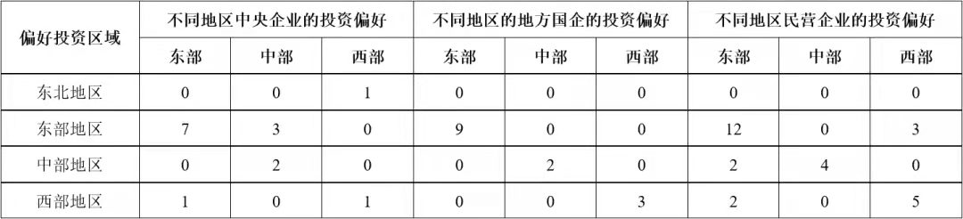 分析表中數(shù)據(jù)可以看出:不同地區(qū)的中央企業(yè),其區(qū)域投資偏好依舊集中在本地區(qū),但也有部分企業(yè)傾向投資其他區(qū)域;不同地區(qū)的地方國(guó)企,所有地區(qū)都是100%更傾向于投資本區(qū)域的項(xiàng)目;不同地區(qū)的民營(yíng)企業(yè),其偏好分布則相對(duì)分散。