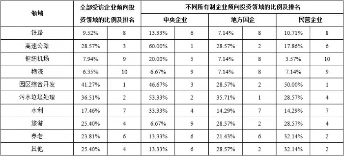 為了提升研究的實(shí)踐指導(dǎo)意義,本次調(diào)研對(duì)各受訪企業(yè)的投資領(lǐng)域選擇范圍進(jìn)行了明確的限定,即在2018年國(guó)務(wù)院發(fā)布的《關(guān)于保持基礎(chǔ)設(shè)施領(lǐng)域補(bǔ)短板力度的指導(dǎo)意見》中提到的“補(bǔ)短板”領(lǐng)域中進(jìn)行選擇,具體細(xì)分為鐵路、高速公路、樞紐機(jī)場(chǎng)、物流、園區(qū)綜合開發(fā)、污水垃圾處理、水利、旅游、養(yǎng)老及其他等多個(gè)領(lǐng)域,調(diào)研中邀請(qǐng)受訪企業(yè)選擇不多于三個(gè)本企業(yè)傾向投資的領(lǐng)域。