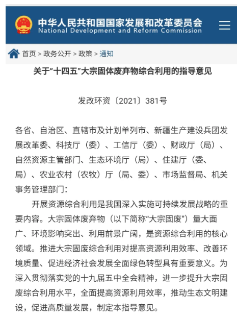 新階段大宗固廢綜合利用高質(zhì)量發(fā)展思路 近日,國家發(fā)展改革委聯(lián)合九部門印發(fā)了《關(guān)于“十四五”大宗固體廢棄物綜合利用的指導(dǎo)意見》(發(fā)改環(huán)資〔2021〕381號,以下簡稱《指導(dǎo)意見》)。這是今后五年推進(jìn)大宗固廢綜合利用產(chǎn)業(yè)高質(zhì)量發(fā)展的行動指南,是落實“十四五”時期大幅提高資源利用效率發(fā)展目標(biāo)的重要部署,為資源綜合利用產(chǎn)業(yè)立足新發(fā)展階段,貫徹新發(fā)展理念指明了方向。