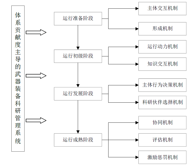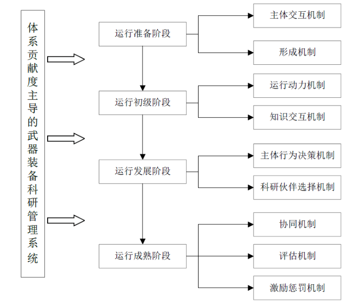 綜上所述,本文認(rèn)為武器裝備體系貢獻(xiàn)度評估理論層面的完善首先要從基本的管理機(jī)制入手,逐步探討體系貢獻(xiàn)度主導(dǎo)的武器裝備科研管理系統(tǒng)的運(yùn)行規(guī)律,圖1中展示了相關(guān)運(yùn)行機(jī)制與管理系統(tǒng)發(fā)展階段之間的作用關(guān)系。