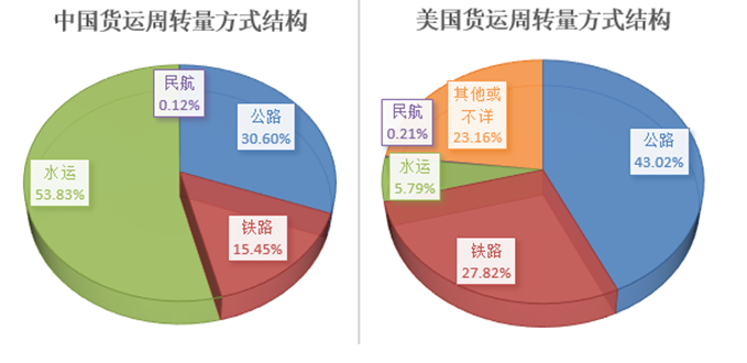 圖3 中美貨運周轉(zhuǎn)量方式結(jié)構(gòu)對比