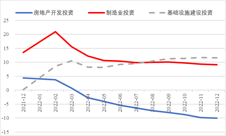 隨著疫情政策的轉變帶來經(jīng)濟活動復蘇,2023年我國的經(jīng)濟形勢將顯著好于2022年,在外需轉弱的情況下,我國亟待拉動內(nèi)需,充分發(fā)揮投資的關鍵作用,保持經(jīng)濟穩(wěn)定增長。綜合來看,在推動制造業(yè)高端化、智能化、綠色化發(fā)展的政策環(huán)境下,制造業(yè)投資尤其是高技術制造業(yè)投資將保持穩(wěn)步高速增長。能源、交通、水利和新型基礎設施建設仍是基建投資的重點領域,在財政增量工具繼續(xù)支持下,基建投資將依然強勁。隨著針對房地產(chǎn)市場供需兩端的政策不斷優(yōu)化,2023年房地產(chǎn)投資降幅有望收窄,但由于內(nèi)外部資金依舊承壓,房地產(chǎn)企業(yè)總體處于降杠桿的進程中,房地產(chǎn)開發(fā)投資恢復仍需一定時間。綜上判斷,2023年固定資產(chǎn)投資有望實現(xiàn)持續(xù)平穩(wěn)增長,預計累計同比增速在6%左右。