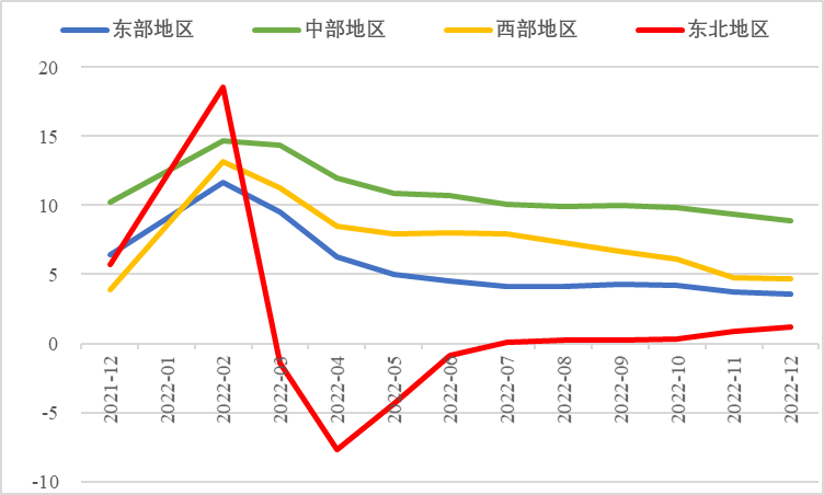 2022年1—12月,東部地區(qū)投資同比增長3.6%,較前三季度、上半年、一季度分別回落0.7個、0.9個、5.9個百分點;中部地區(qū)投資增長8.9%,較前三季度、上半年、一季度分別回落1.1個、1.8個、5.5個百分點;西部地區(qū)投資增長4.7%,較前三季度、上半年、一季度分別回落2個、3.3個、6.6個百分點;東北地區(qū)投資增長1.2%,較前三季度、上半年、一季度分別提升1個、2.1個、2.6個百分點??偟膩砜矗胁亢臀鞑康貐^(qū)投資保持較快增長,東部地區(qū)增速較低,東北地區(qū)投資在上半年負增長的基礎上止跌,呈恢復增長態(tài)勢。