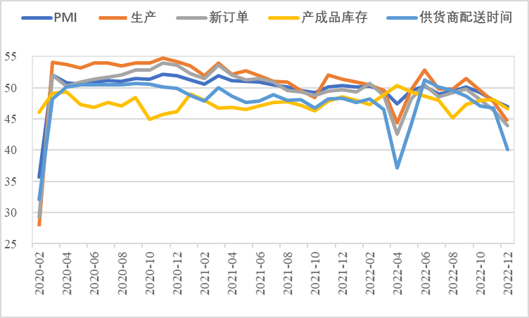 從分類指數(shù)構成看,12月制造業(yè)生產(chǎn)指數(shù)和新訂單指數(shù)為44.6%、43.9%,分別較上月下降3.2個、2.5個百分點,均為2022年5月以來的最低值,制造業(yè)生產(chǎn)和市場需求持續(xù)減少;從業(yè)人員指數(shù)為44.8%,較上月下降2.6個百分點,為2020年3月以來的最低水平,制造業(yè)企業(yè)用工景氣度下降;供應商配送時間指數(shù)為40.1%,較上月下降6.6個百分點,表明制造業(yè)原材料供應商交貨時間有所延長。總的來看,制造業(yè)供需兩端均不同程度受損,供給沖擊和需求收縮壓力仍然突出,成為制約當前經(jīng)濟恢復的突出問題。