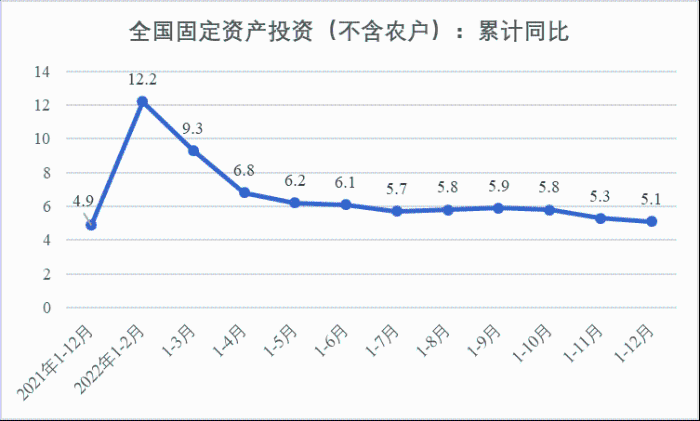2022年1—12月,我國固定資產(chǎn)投資(不含農(nóng)戶,下同)572138億元,同比增長5.1%。一季度投資增速達到9.3%的年內(nèi)高點,上半年、前三季度分別降至6.1%、5.9%,年初投資增速較高的重要原因是2022年專項債部分限額提前下達等系列政策發(fā)揮效果,之后受國外地緣政治沖突、國內(nèi)疫情多點散發(fā)等因素影響,投資增速有所下降,但降幅逐季收窄。一季度、上半年、前三季度、全年固定資產(chǎn)投資增速分別較同期國內(nèi)生產(chǎn)總值增速高了4.5個、3.6個、2.9個和2.1個百分點,投資成為當前穩(wěn)定宏觀經(jīng)濟大盤的關鍵力量。