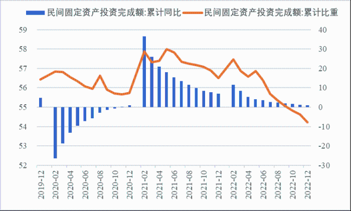 1—12月,我國固定資產(chǎn)投資三年平均增速為4.3%,低于2019年同期1.1個百分點,全面恢復到疫情前水平仍需一定時間。尤其是民間投資受疫情沖擊較為嚴重,復蘇難度較大。一季度、上半年、前三季度、全年民間投資分別同比增長8.4%、3.5%、2%、0.9%,低于整體投資增速0.9個、2.6個、3.9個、4.2個百分點,與整體投資增速的差距逐季拉大。從占比看,截至12月底民間投資累計占固定資產(chǎn)投資的比重已降至54.2%,低于2019年同期2.2個百分點。