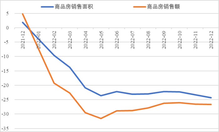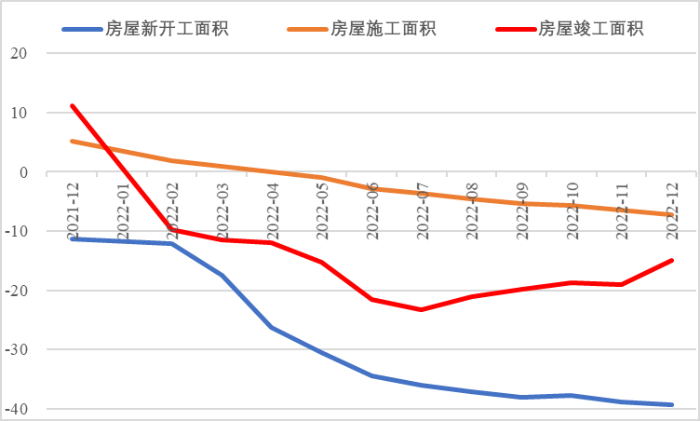 2022年1—12月,房地產(chǎn)投資132895億元,同比下跌10%,其中住宅投資100646億元,下降9.5%。從房企融資數(shù)據(jù)看,一季度末、二季度末、三季度末、四季度末房地產(chǎn)開發(fā)企業(yè)到位資金分別同比下降19.6%、25.3%、8%、25.9%,四季度增速降幅進一步擴大;1—12月房企資金來源中,國內(nèi)貸款、自籌資金、定金及預收款、個人按揭貸款分別同比下降25.4%、19.1%、33.3%、26.5%,房企融資能力明顯不足。從房屋開工竣工數(shù)據(jù)看,1—12月全國房屋新開工面積同比下降39.4%,其中住宅新開工面積下降39.8%,降幅較前三季度進一步擴大。