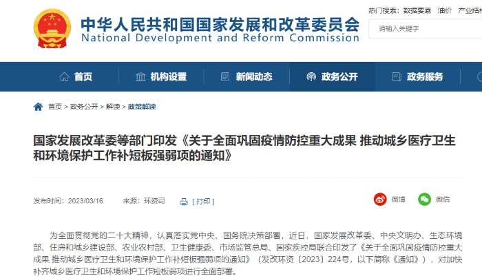 全面鞏固疫情防控重大成果,加強(qiáng)醫(yī)療衛(wèi)生和環(huán)境保護(hù)工作是最大程度保護(hù)人民生命安全和身體健康,最大限度減少疫情對(duì)經(jīng)濟(jì)社會(huì)發(fā)展的影響,推動(dòng)經(jīng)濟(jì)平穩(wěn)健康發(fā)展的重要舉措。近日,國(guó)家發(fā)展改革委、中央文明辦、生態(tài)環(huán)境部、住房和城鄉(xiāng)建設(shè)部、農(nóng)業(yè)農(nóng)村部、國(guó)家衛(wèi)生健康委、市場(chǎng)監(jiān)管總局、國(guó)家疾控局聯(lián)合印發(fā)《關(guān)于全面鞏固疫情防控重大成果 推動(dòng)城鄉(xiāng)醫(yī)療衛(wèi)生和環(huán)境保護(hù)工作補(bǔ)短板強(qiáng)弱項(xiàng)的通知》(發(fā)改環(huán)資〔2023〕224號(hào),以下簡(jiǎn)稱《通知》),對(duì)全面鞏固疫情防控重大成果,加快補(bǔ)齊城鄉(xiāng)醫(yī)療衛(wèi)生和環(huán)境保護(hù)短板弱項(xiàng)作出系統(tǒng)部署?!锻ㄖ肥锹鋵?shí)黨的二十大精神的具體舉措,對(duì)推動(dòng)城鄉(xiāng)醫(yī)療衛(wèi)生和環(huán)境保護(hù)工作取得更大進(jìn)展,加快建設(shè)健康中國(guó)、美麗中國(guó)具有重要意義。