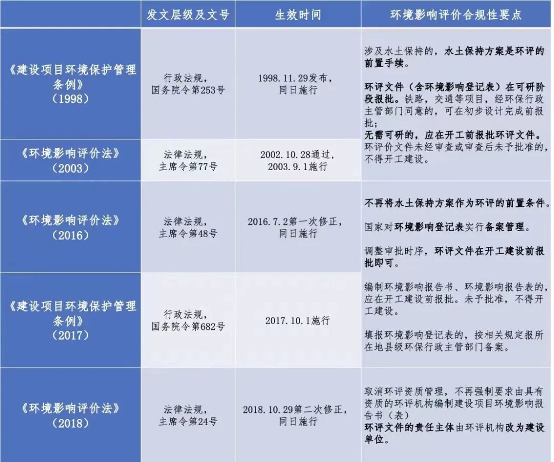 1998年11月29日國務院發(fā)布并施行的《建設項目環(huán)境保護管理條例》和2003年9月1日起正式施行的《環(huán)境影響評價法》,一直以來都是環(huán)境影響評價有關工作的基本遵循。根據(jù)兩部法規(guī)的修訂過程,可將政策主要內(nèi)容以2016年為基準按照兩階段進行梳理。