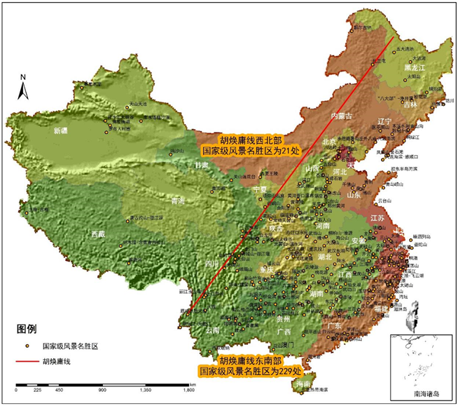 圖2 胡煥庸線下的中國國家級風景名勝區(qū)分布(制圖:孫艷芝)