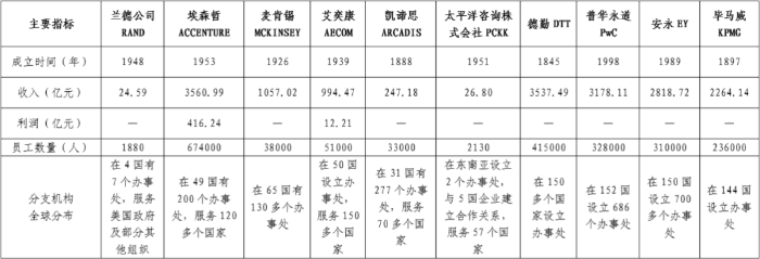 (三)研究思路 重點(diǎn)圍繞經(jīng)營(yíng)規(guī)模、全球戰(zhàn)略布局、集團(tuán)化發(fā)展、數(shù)字化發(fā)展、人才培養(yǎng)等方面開(kāi)展對(duì)比研究,為中咨公司打造世界一流咨詢機(jī)構(gòu)提出初步的方向性戰(zhàn)略構(gòu)想,更好地服務(wù)公司高質(zhì)量發(fā)展總體戰(zhàn)略。充分發(fā)揮龍頭示范作用,加強(qiáng)精細(xì)化管理,全面提升核心競(jìng)爭(zhēng)力,助力中咨公司加快建設(shè)成為國(guó)內(nèi)有權(quán)威、國(guó)際有影響的國(guó)家高端智庫(kù)、世界一流咨詢機(jī)構(gòu),體現(xiàn)智庫(kù)型中央企業(yè)的使命擔(dān)當(dāng)。 二、經(jīng)營(yíng)規(guī)?,F(xiàn)狀分析 (一)對(duì)比企業(yè)經(jīng)營(yíng)規(guī)模情況 1.智庫(kù)型企業(yè) 蘭德公司(RAND)是全球頂級(jí)智庫(kù)型企業(yè)之一。蘭德公司成立于1948年,總部設(shè)在美國(guó)加利福尼亞州的圣莫尼卡,是國(guó)際最知名的非營(yíng)利性的研究機(jī)構(gòu)之一,被譽(yù)為現(xiàn)代智囊的“大腦集中營(yíng)”“超級(jí)軍事學(xué)院”,致力于以嚴(yán)謹(jǐn)?shù)姆治鲅芯縼?lái)推進(jìn)決策與政策制定。擁有來(lái)自50多個(gè)國(guó)家的1880多名員工,半數(shù)以上的研究人員持有一個(gè)或多個(gè)博士學(xué)位,在2020年全球頂級(jí)智庫(kù)綜合榜單中排名第七,2021年總收入為24.59億元(折人民幣)。 業(yè)務(wù)領(lǐng)域范圍較廣。蘭德公司資金來(lái)源廣泛,目前軍隊(duì)、政府的資助仍然超過(guò)一半以上。蘭德公司主要為美國(guó)軍方、美國(guó)政府機(jī)構(gòu)、基金會(huì)、高校以及私營(yíng)企業(yè)等提供咨詢服務(wù),研究領(lǐng)域主要涉及軍事科技、國(guó)家安全、國(guó)際事務(wù)、公共安全、法律與商業(yè)、教育、健康、基礎(chǔ)設(shè)施、交通、能源、環(huán)境、網(wǎng)絡(luò)通訊、數(shù)據(jù)科學(xué)、社會(huì)公平等。 2.管理咨詢企業(yè) 埃森哲(ACCENTURE)。埃森哲成立于1953年,是一家全球領(lǐng)先的專業(yè)服務(wù)公司,在數(shù)字化、云計(jì)算與網(wǎng)絡(luò)安全領(lǐng)域擁有全球領(lǐng)先的能力。埃森哲秉承“科技融靈智,匠心承未來(lái)”的企業(yè)使命,致力于通過(guò)引領(lǐng)變革創(chuàng)造價(jià)值,為客戶、員工、股東、合作伙伴與整個(gè)社會(huì)創(chuàng)造美好未來(lái)。埃森哲憑借獨(dú)特的業(yè)內(nèi)經(jīng)驗(yàn)與專業(yè)技能,以及翹楚全球的卓越技術(shù)中心和智能運(yùn)營(yíng)中心,為客戶提供戰(zhàn)略和咨詢、互動(dòng)體驗(yàn)、技術(shù)服務(wù)和智能運(yùn)營(yíng)等全方位服務(wù),業(yè)務(wù)涵蓋40多個(gè)行業(yè),以及企業(yè)日常運(yùn)營(yíng)部門的各個(gè)職能。埃森哲是《財(cái)富》全球500強(qiáng)企業(yè)之一,在全球49個(gè)國(guó)家設(shè)立了200多個(gè)辦事處,服務(wù)于120多個(gè)國(guó)家的客戶,擁有674000多名員工,2021年總收入為3560.99億元(折人民幣)。 麥肯錫(MCKINSEY)。麥肯錫成立于1926年,其定位是幫助領(lǐng)先的企業(yè)機(jī)構(gòu)實(shí)現(xiàn)顯著、持久的經(jīng)營(yíng)業(yè)績(jī)改善,打造能夠吸引、培育和激勵(lì)杰出人才的優(yōu)秀組織機(jī)構(gòu)。主營(yíng)業(yè)務(wù)是為客戶特別是企業(yè)設(shè)計(jì)、制定相配套的一體化解決方案,包括戰(zhàn)略開(kāi)發(fā)、經(jīng)營(yíng)運(yùn)作、組織結(jié)構(gòu)等,業(yè)務(wù)范圍涉及汽車、銀行、能源、保健、保險(xiǎn)、制造、公共事業(yè)、零售、電信和交通等領(lǐng)域。目前擁有來(lái)自80多個(gè)國(guó)家38000多名員工,2021年總收入為1057.02億元(折人民幣)。 德勤(DTT)。德勤成立于1845年,是全球領(lǐng)先的專業(yè)服務(wù)機(jī)構(gòu),世界四大會(huì)計(jì)師事務(wù)所之一。德勤品牌連續(xù)第四年被Brand Finance(品牌金融)評(píng)為全球最具影響力及最具價(jià)值商業(yè)服務(wù)品牌,入選全球最佳雇主榜單,為近90%的《財(cái)富》全球500強(qiáng)企業(yè)以及數(shù)千家民營(yíng)企業(yè)提供專業(yè)服務(wù)。德勤業(yè)務(wù)范圍包括審計(jì)和鑒證、稅務(wù)和法律、咨詢、財(cái)務(wù)咨詢和風(fēng)險(xiǎn)咨詢服務(wù)等,涉及消費(fèi)品行業(yè)、能源、資源與工業(yè)、金融服務(wù)、政府與公共服務(wù)、生命科學(xué)與醫(yī)療保健、技術(shù)、媒體與電信等領(lǐng)域。德勤在全球150多個(gè)國(guó)家設(shè)立辦事處,擁有415000多名員工,2021年總收入為3537.49億元(折人民幣)。 普華永道(PwC)。普華永道成立于1998年,是一家致力于“在社會(huì)中建立信任并解決重要問(wèn)題”的全球?qū)I(yè)服務(wù)聯(lián)盟組織。在中國(guó)注冊(cè)會(huì)計(jì)師協(xié)會(huì)《2021年度會(huì)計(jì)師事務(wù)所綜合評(píng)價(jià)百家排名信息》中,普華永道連續(xù)第十九年(2003年~2021年)蟬聯(lián)該項(xiàng)排名第一。普華永道主營(yíng)業(yè)務(wù)包括戰(zhàn)略變革,流程優(yōu)化和技術(shù)解決方案等,業(yè)務(wù)范圍涉及航空航天、國(guó)防與安全、汽車、資本項(xiàng)目和基礎(chǔ)設(shè)施、消費(fèi)市場(chǎng)、能源、公用事業(yè)和資源、工程與建筑、金融服務(wù)、政府和公共服務(wù)、醫(yī)療、酒店與休閑、工業