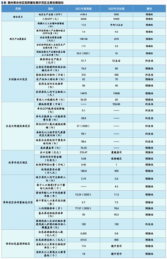 探索革命老區(qū)振興發(fā)展新路徑 ——《贛州革命老區(qū)高質(zhì)量發(fā)展示范區(qū)發(fā)展規(guī)劃》解讀 田煜 董繼紅 贛州革命老區(qū)是土地革命戰(zhàn)爭(zhēng)時(shí)期中央蘇區(qū)的主體和核心區(qū)域,中華蘇維埃共和國(guó)在此奠基,中央紅軍氣壯山河的二萬(wàn)五千里長(zhǎng)征從瑞金、于都等地出發(fā),艱苦卓絕的南方三年游擊戰(zhàn)爭(zhēng)在贛南山區(qū)浴血堅(jiān)持,以毛澤東同志為代表的老一輩無(wú)產(chǎn)階級(jí)革命家在這里留下閃光足跡。黨中央高度關(guān)注贛州革命老區(qū)振興發(fā)展,在習(xí)近平總書記的親自關(guān)心和推動(dòng)下,2012年6月,國(guó)務(wù)院出臺(tái)《關(guān)于支持贛南等原中央蘇區(qū)振興發(fā)展的若干意見(jiàn)》,開啟了贛南蘇區(qū)振興發(fā)展的嶄新篇章。 2021年1月,國(guó)務(wù)院出臺(tái)《關(guān)于新時(shí)代支持革命老區(qū)振興發(fā)展的意見(jiàn)》,提出研究支持贛州、三明等城市建設(shè)革命老區(qū)高質(zhì)量發(fā)展示范區(qū)。2022年3月,國(guó)務(wù)院批復(fù)同意《贛州革命老區(qū)高質(zhì)量發(fā)展示范區(qū)建設(shè)方案》。近期,經(jīng)江西省人民政府同意,《贛州革命老區(qū)高質(zhì)量發(fā)展示范區(qū)發(fā)展規(guī)劃》(以下簡(jiǎn)稱《規(guī)劃》)正式印發(fā)?!兑?guī)劃》明確了示范區(qū)建設(shè)的戰(zhàn)略目標(biāo)、重點(diǎn)任務(wù)和支持政策,為贛州在全國(guó)革命老區(qū)高質(zhì)量發(fā)展上作示范、勇爭(zhēng)先繪就了“路線圖”“施工圖”。 01 《規(guī)劃》為贛南蘇區(qū)振興發(fā)展指明了新發(fā)展階段的行動(dòng)目標(biāo) 黨的十八大以來(lái),在黨中央堅(jiān)強(qiáng)領(lǐng)導(dǎo)和關(guān)心關(guān)懷下,在中央國(guó)家機(jī)關(guān)及有關(guān)單位的鼎力支持下,贛州經(jīng)濟(jì)社會(huì)發(fā)展取得歷史性成就。經(jīng)過(guò)十年振興發(fā)展,經(jīng)濟(jì)實(shí)力大步跨越,2012-2021年,贛州市地區(qū)生產(chǎn)總值從1700億元增至3658億元,年均增速9.2%,高于同期全國(guó)、全省水平2.5、0.5個(gè)百分點(diǎn),人均GDP與全國(guó)平均水平的差距縮小了10.8個(gè)百分點(diǎn);特色產(chǎn)業(yè)揚(yáng)優(yōu)成勢(shì),營(yíng)商環(huán)境持續(xù)優(yōu)化,2022年,實(shí)際利用外資3.73億美元、進(jìn)出口總額1033.1億元,在全國(guó)革命老區(qū)重點(diǎn)城市中位居前列。生態(tài)屏障持續(xù)筑牢,水土保持生態(tài)治理“贛州模式”、山水林田湖草沙綜合治理“尋烏經(jīng)驗(yàn)”在全國(guó)推廣。贛州人民堅(jiān)定執(zhí)著聽黨話、感黨恩、跟黨走,紅色基因薪火相傳,煥發(fā)新的時(shí)代榮光。 立足新階段,《規(guī)劃》錨定2035年與全國(guó)同步基本實(shí)現(xiàn)社會(huì)主義現(xiàn)代化的遠(yuǎn)景目標(biāo),綜合考慮贛州市發(fā)展條件和外部環(huán)境,緊密銜接“十四五”規(guī)劃綱要及各領(lǐng)域?qū)m?xiàng)規(guī)劃,在綜合實(shí)力、產(chǎn)業(yè)發(fā)展、鄉(xiāng)村振興、生態(tài)文明、改革開放、共同富裕、紅色傳承7個(gè)方面設(shè)置了36項(xiàng)主要指標(biāo)。指標(biāo)選取緊扣“6個(gè)區(qū)”戰(zhàn)略定位和“十四五”階段性任務(wù),突出代表性,同時(shí)有利于考核監(jiān)測(cè)任務(wù)的落實(shí)情況。在確定經(jīng)濟(jì)增長(zhǎng)目標(biāo)時(shí),《規(guī)劃》對(duì)標(biāo)“十四五”規(guī)劃綱要,同時(shí)結(jié)合2020-2022年贛州市實(shí)際經(jīng)濟(jì)增長(zhǎng)情況,提出了到2025年GDP突破5500億元的預(yù)期目標(biāo)。在設(shè)置反映產(chǎn)業(yè)發(fā)展的相關(guān)指標(biāo)時(shí),《規(guī)劃》充分對(duì)接經(jīng)濟(jì)高質(zhì)量發(fā)展內(nèi)涵,納入數(shù)字經(jīng)濟(jì)、科技創(chuàng)新等反映質(zhì)量效益的指標(biāo),體現(xiàn)了贛州革命老區(qū)堅(jiān)定不移強(qiáng)化科技創(chuàng)新,著力提升產(chǎn)業(yè)層次的勇氣和決心。 資料來(lái)源:《贛州革命老區(qū)高質(zhì)量發(fā)展示范區(qū)發(fā)展規(guī)劃》 02 《規(guī)劃》聚焦新發(fā)展理念因地制宜謀劃了作示范的六大領(lǐng)域 立足新起點(diǎn),奮進(jìn)新征程,贛州堅(jiān)持在推進(jìn)中國(guó)式現(xiàn)代化的偉大進(jìn)程中,探索革命老區(qū)振興發(fā)展新路徑?!兑?guī)劃》圍繞“六個(gè)作示范”領(lǐng)域,細(xì)化、實(shí)化了構(gòu)建現(xiàn)代產(chǎn)業(yè)體系、全面推進(jìn)鄉(xiāng)村振興、建設(shè)美麗中國(guó)“贛州樣板”、堅(jiān)持深化改革開放、健全公共服務(wù)體系、賡續(xù)紅色血脈六個(gè)方面的重點(diǎn)任務(wù)。 (一)構(gòu)建現(xiàn)代產(chǎn)業(yè)體系,推進(jìn)產(chǎn)業(yè)創(chuàng)新發(fā)展先行示范。習(xí)近平總書記指出,要堅(jiān)持面向世界科技前沿、面向經(jīng)濟(jì)主戰(zhàn)場(chǎng)、面向國(guó)家重大需求、面向人民生命健康,加快實(shí)現(xiàn)高水平科技自立自強(qiáng)。近年來(lái),贛州革命老區(qū)堅(jiān)定不移走集群發(fā)展、創(chuàng)新發(fā)展、融合發(fā)展道路,加快培育特色優(yōu)勢(shì)產(chǎn)業(yè)集群,現(xiàn)代家居產(chǎn)業(yè)從百億“草根經(jīng)濟(jì)”躍升為2500億元的產(ch