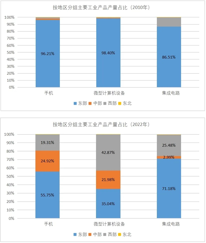 我國(guó)產(chǎn)業(yè)轉(zhuǎn)移的結(jié)構(gòu)不斷升級(jí),中西部地區(qū)除主要承接?xùn)|部地區(qū)調(diào)整優(yōu)化的勞動(dòng)密集型產(chǎn)業(yè)外,還積極利用產(chǎn)業(yè)基礎(chǔ)和資源稟賦優(yōu)勢(shì),加大電子信息等資本密集型和技術(shù)密集型產(chǎn)業(yè)承接力度,整體呈現(xiàn)出產(chǎn)業(yè)轉(zhuǎn)移與產(chǎn)業(yè)升級(jí)并行趨勢(shì)。近年來(lái),戰(zhàn)略性新興產(chǎn)業(yè)也開(kāi)始向中西部核心城市集聚,如合肥芯片產(chǎn)業(yè)、武漢光纖通信產(chǎn)業(yè)、西安半導(dǎo)體產(chǎn)業(yè)、重慶新能源汽車(chē)產(chǎn)業(yè)等。2010-2022年,我國(guó)東部地區(qū)手機(jī)、微型計(jì)算機(jī)、集成電路等主要工業(yè)產(chǎn)品產(chǎn)量占全國(guó)比重分別下降40、63和15個(gè)百分點(diǎn);而中部地區(qū)三種產(chǎn)品占比分別上升23、21和3個(gè)百分點(diǎn),西部地區(qū)三種產(chǎn)品占比分別上升18、42和12個(gè)百分點(diǎn)。