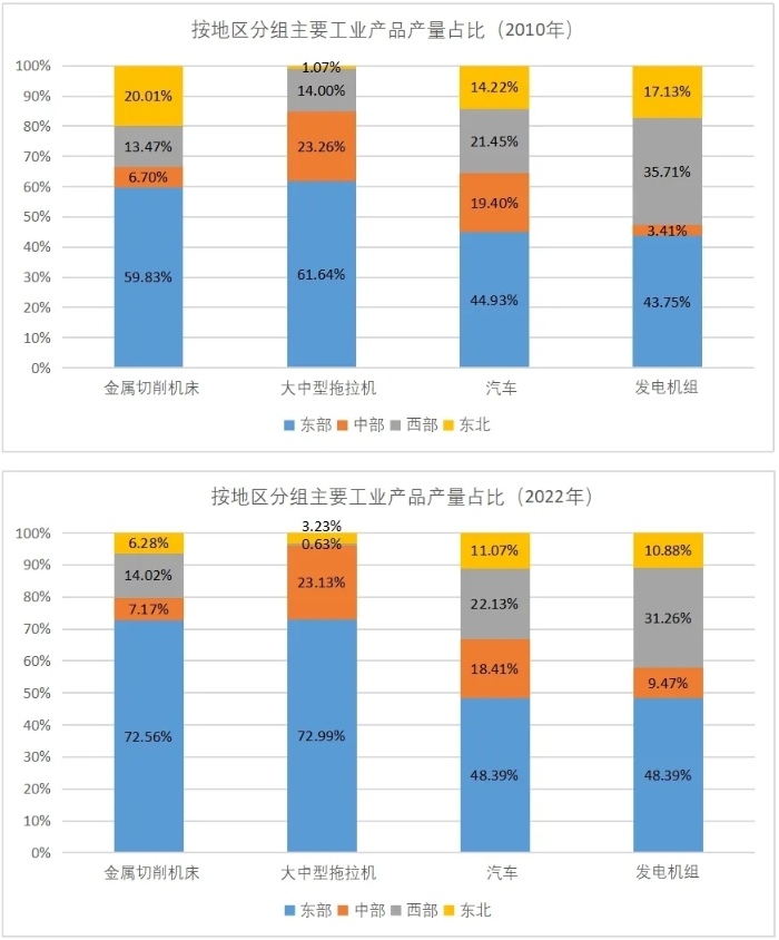 隨著我國(guó)基礎(chǔ)設(shè)施建設(shè)大發(fā)展,中西部交通運(yùn)輸條件與東部的差距在不斷縮小,特別是互聯(lián)網(wǎng)、移動(dòng)通信等新型基礎(chǔ)設(shè)施的發(fā)展,使得企業(yè)可以在不同地區(qū)通過(guò)遠(yuǎn)程辦公、在線(xiàn)會(huì)議等進(jìn)行業(yè)務(wù)協(xié)作和管理,“遠(yuǎn)程研發(fā)+異地中試+異地生產(chǎn)+異地操作”等模式應(yīng)運(yùn)而生。以汽車(chē)產(chǎn)業(yè)為例,國(guó)內(nèi)知名車(chē)企相繼進(jìn)入中西部,在重慶、成都、武漢、長(zhǎng)沙、鄭州等地建成了相當(dāng)規(guī)模的整車(chē)和零部件生產(chǎn)基地,但其研發(fā)中心依然設(shè)置在東部沿海發(fā)達(dá)地區(qū)。同時(shí),中西部和東北地區(qū)也可以通過(guò)在東部地區(qū)設(shè)立研發(fā)基地,快速獲取發(fā)達(dá)地區(qū)人才、區(qū)位、資金優(yōu)勢(shì)。此外,東北和西部地區(qū)部分傳統(tǒng)優(yōu)勢(shì)產(chǎn)業(yè)出現(xiàn)向東部地區(qū)轉(zhuǎn)出的現(xiàn)象。2010-2022年,東北地區(qū)金屬切削機(jī)床、汽車(chē)和發(fā)電機(jī)組等主要工業(yè)產(chǎn)品產(chǎn)量占全國(guó)比重分別下降14、3和6個(gè)百分點(diǎn),西部地區(qū)大中型拖拉機(jī)占比下降13個(gè)百分點(diǎn);而同期東部地區(qū)金屬切削機(jī)床、大中型拖拉機(jī)、汽車(chē)和發(fā)電機(jī)組等主要工業(yè)產(chǎn)品產(chǎn)量占比分別上升13、11、3和5個(gè)百分點(diǎn)。