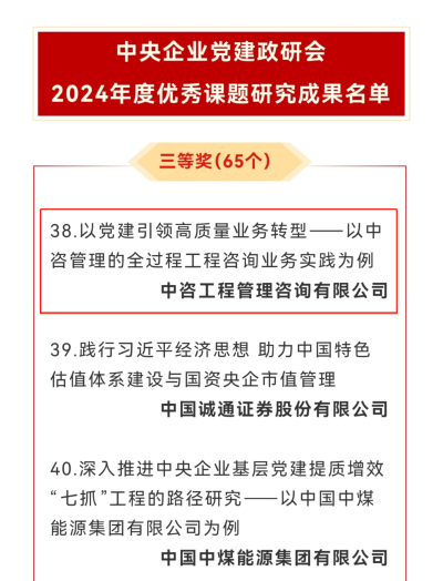 黨建領航促發(fā)展,政研成果傳佳訊。近日,中央企業(yè)黨建政研會2024年度優(yōu)秀課題研究成果評選結果公布,中咨公司所屬的中咨工程管理咨詢有限公司(以下簡稱中咨管理公司)《以黨建引領高質(zhì)量業(yè)務轉(zhuǎn)型——以中咨管理的全過程工程咨詢業(yè)務實踐為例》研究成果榮獲三等獎。