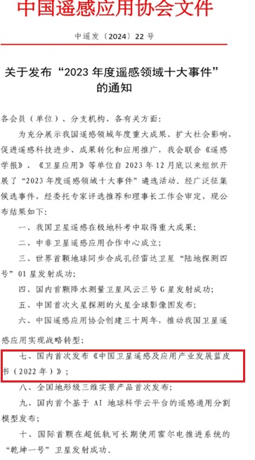 《中國衛(wèi)星遙感及應(yīng)用產(chǎn)業(yè)發(fā)展藍皮書(2022年)》是我國首次對中國衛(wèi)星遙感及應(yīng)用產(chǎn)業(yè)國民經(jīng)濟貢獻度的定量化呈現(xiàn),對于有效支撐政府主管部門的投資決策和指導(dǎo)商業(yè)航天發(fā)展、引導(dǎo)社會資本參與航天事業(yè)等都具有重大意義,是衛(wèi)星遙感及應(yīng)用產(chǎn)業(yè)高質(zhì)量發(fā)展的重要里程碑?!皣鴥?nèi)首次發(fā)布《中國衛(wèi)星遙感及應(yīng)用產(chǎn)業(yè)發(fā)展藍皮書(2022年)》” 入選中國遙感應(yīng)用協(xié)會評選的“2023年度遙感領(lǐng)域十大事件”。