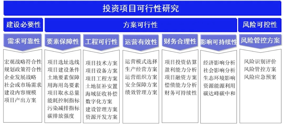 皮之不存,毛將焉附?項目自身可行是特許經(jīng)營方案成立的前提。115號文明確要求,項目實施機構應參照可行性研究報告編寫規(guī)范,牽頭編制特許經(jīng)營方案,并比照政府投資項目審批權限和要求,由有關方面履行審核手續(xù)。2023年4月,國家發(fā)展改革委印發(fā)《投資項目可行性研究報告編寫大綱及說明》(簡稱《可研大綱》),提出了項目可行性研究三個目標、七個維度的總體框架,如圖3所示,成為新時代指導全國項目可行性研究工作的重要制度性規(guī)范。