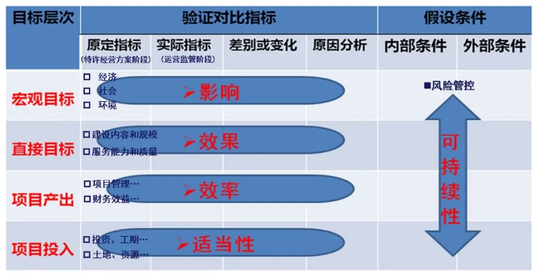 運營評價。在最長可達40年的特許經(jīng)營期,定期開展運營評價是實現(xiàn)預期產(chǎn)出和回報的必要手段。特許經(jīng)營方案階段的運營評價,是在現(xiàn)有假設條件下,提出運營標準,確定項目投入、產(chǎn)出、直接目標和宏觀目標的具體評價指標,為實施機構在運營監(jiān)管階段實際開展評價確立比較基準。PPP項目運營監(jiān)管階段的運營評價,應遵循邏輯框架法的基本原理(見圖5),通過驗證對比特許經(jīng)營方案階段確定的基準指標(原定指標),分析實際指標的偏差及其原因,評價PPP項目投入的適當性,產(chǎn)出效率、實施效果和外部影響,并結合內(nèi)外部的假設條件變化情況,判斷項目可持續(xù)性。如果各項假設條件并不具備,對應的投入、產(chǎn)出、直接目標和宏觀目標就難以實現(xiàn);為保障PPP項目可持續(xù),需要及時制定或調(diào)整風險管控方案。