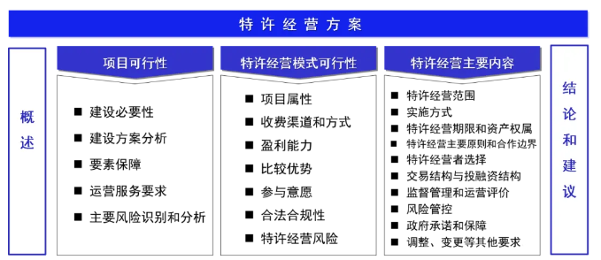 根據(jù)國家發(fā)展改革委辦公廳印發(fā)的《特許經(jīng)營方案大綱》,特許經(jīng)營方案主要構建包括項目可行性、特許經(jīng)營模式可行性和特許經(jīng)營主要內(nèi)容三個方面,如圖2。