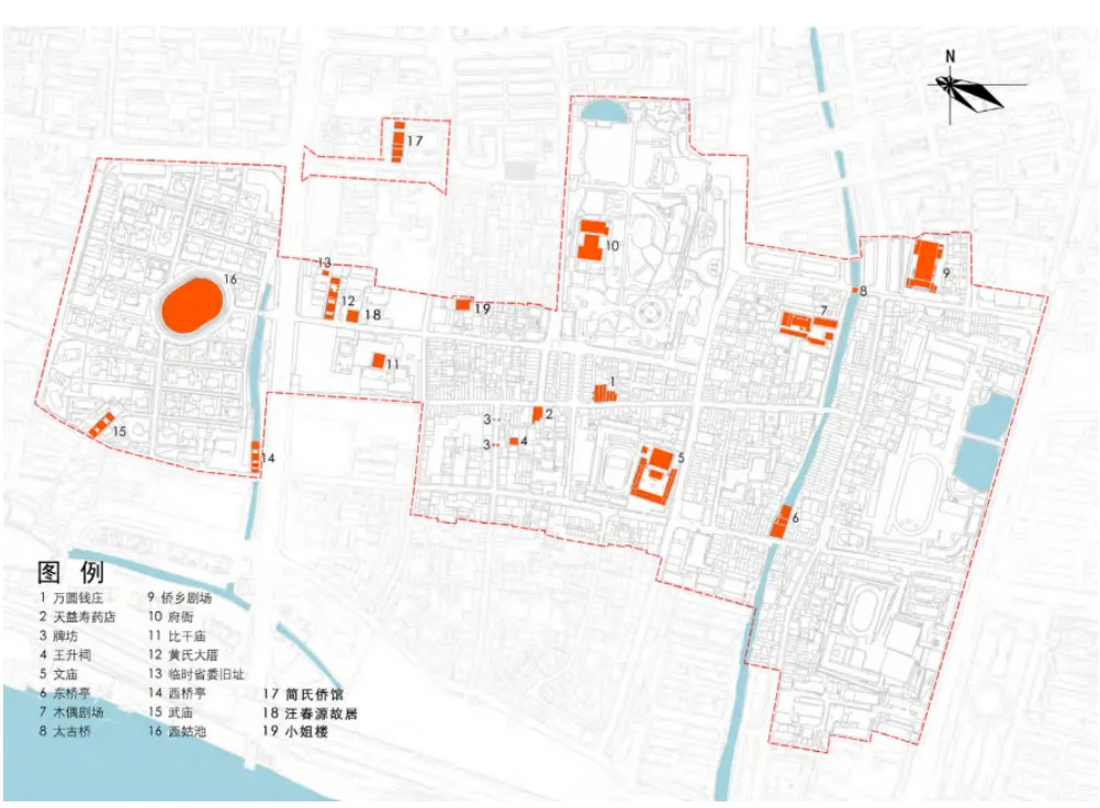 漳州古城文物古跡眾多,核心保護(hù)區(qū)建筑以晚清、民國(guó)時(shí)期為主(圖1),不乏比干廟、文廟等宋代及明代具有濃厚歷史風(fēng)味的建筑。同時(shí),古城內(nèi)部留存著許多名人舊居及知名場(chǎng)所(圖2),這些建筑見(jiàn)證了漳州多年來(lái)的歷史變遷和文化發(fā)展,是連接歷史與未來(lái)的通道,也是傳承文化記憶的媒介。