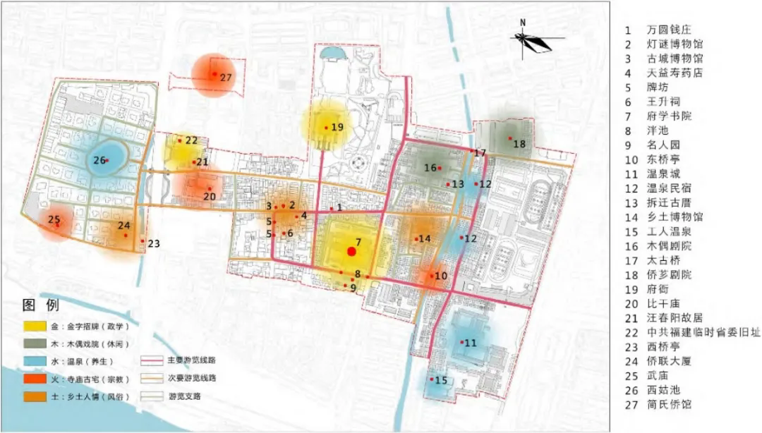 深入挖掘漳州古城內(nèi)歷史文化資源,保留漳州古城整體風(fēng)貌與建筑特色,進(jìn)行改造升級(jí)。首先,梳理古城內(nèi)歷史建筑,識(shí)別和提取其中蘊(yùn)含的金、木、水、火、土文化基因[8],進(jìn)行保護(hù)、修繕和再利用。其中,金主要為府衙、文廟等政府和文化建筑,木主要為木偶戲院等休閑建筑,水主要為溫泉等養(yǎng)生建筑,火主要為寺廟古宅等宗教建筑,土主要為體現(xiàn)鄉(xiāng)土人情的風(fēng)俗建筑。其次,對(duì)服務(wù)、餐飲、購(gòu)物等傳統(tǒng)業(yè)態(tài)進(jìn)行升級(jí),并植入展覽、體驗(yàn)等新興業(yè)態(tài)。最后,組織主要和次要游覽線路。從點(diǎn)、線、面三個(gè)不同層次實(shí)現(xiàn)整個(gè)古城的活化與發(fā)展(圖7),最終將其打造成為閩南地區(qū)的特色文化名片。