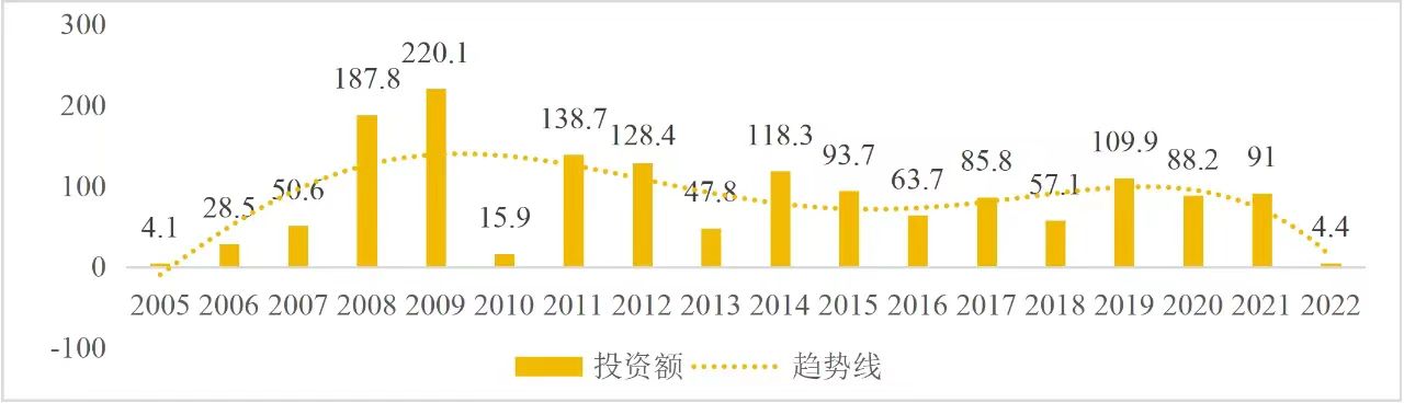 企業(yè)境外投資研究之二: 中央企業(yè)境外投資情況 楊凱越 編者按:根據(jù)商務(wù)部2023年10月發(fā)布的我國(guó)對(duì)外直接投資統(tǒng)計(jì)數(shù)據(jù),截至2022年,我國(guó)對(duì)外直接投資存量達(dá)27548.1億美元,當(dāng)年對(duì)外直接投資規(guī)模達(dá)1631.2億美元,居世界第二位。截至2022年底,中國(guó)2.9萬(wàn)家境內(nèi)投資者共設(shè)立境外企業(yè)4.66萬(wàn)家,分布在全球190個(gè)國(guó)家(地區(qū)),年末境外企業(yè)資產(chǎn)總額8.4萬(wàn)億美元。隨著“雙循環(huán)”戰(zhàn)略、“走出去”戰(zhàn)略和“一帶一路”倡議的深入推進(jìn)實(shí)施,對(duì)企業(yè)境外投資開(kāi)展系統(tǒng)研究,探索如何更高質(zhì)量地開(kāi)展境外投資,成為當(dāng)前一項(xiàng)重要和緊迫的任務(wù)。本公眾號(hào)將企業(yè)境外投資研究成果以系列文章的形式陸續(xù)刊發(fā),本文是研究報(bào)告的第二部分,供業(yè)界同仁參考。 一、總體情況 中央企業(yè)2013-2019年境外投資年均增速約15%,營(yíng)業(yè)收入增速保持在約4.5%。根據(jù)國(guó)務(wù)院國(guó)資委和社科院聯(lián)合發(fā)布的《中央企業(yè)海外社會(huì)責(zé)任藍(lán)皮書(shū)(2020)》,中央企業(yè)在境外投資發(fā)展時(shí),7%投資第一產(chǎn)業(yè),69%參與第二產(chǎn)業(yè),40%發(fā)展第三產(chǎn)業(yè)。截至2019年底,中央企業(yè)境外資產(chǎn)總額8.1萬(wàn)億元、所有者權(quán)益2.3萬(wàn)億元。其中,81家中央企業(yè)在“一帶一路”沿線承擔(dān)項(xiàng)目數(shù)量逾3400個(gè)。中央企業(yè)承擔(dān)“一帶一路”基礎(chǔ)設(shè)施項(xiàng)目數(shù)比率超過(guò)60%,合同投資額超過(guò)80%。 近年來(lái),中央企業(yè)境外投資及運(yùn)營(yíng)總體仍呈現(xiàn)較為平穩(wěn)的態(tài)勢(shì)。中央企業(yè)2013-2020年境外營(yíng)業(yè)收入總規(guī)模逾24萬(wàn)億元,利潤(rùn)總規(guī)模約6000億元。2021年,中央企業(yè)和單位對(duì)外非金融類(lèi)直接投資642.9億美元,占我國(guó)對(duì)外直接投資比重約36.0%,同比增長(zhǎng)30.7%,逾60%來(lái)自收益再投資。根據(jù)國(guó)務(wù)院國(guó)資委《中央企業(yè)海外發(fā)展報(bào)告(2023)》,截至2022年底,中央企業(yè)境外投資機(jī)構(gòu)和項(xiàng)目逾8000個(gè),境外員工125萬(wàn)人,境外資產(chǎn)總額近8萬(wàn)億元(比2019年略有下降),當(dāng)年境外投資規(guī)模3739億元。 表1 中央企業(yè)境外投資規(guī)模 單位:億美元 數(shù)據(jù)來(lái)源:商務(wù)部2016-2021年度中國(guó)對(duì)外直接投資統(tǒng)計(jì)公報(bào)。 本文根據(jù)中國(guó)全球投資追蹤(China Global Investment Tracker,CGIT)數(shù)據(jù)庫(kù),按照國(guó)務(wù)院國(guó)資委2023年中央企業(yè)名錄,對(duì)我國(guó)中央企業(yè)境外投資情況進(jìn)行了整理。因數(shù)據(jù)口徑不同,中央企業(yè)境外投資規(guī)模與前述商務(wù)部統(tǒng)計(jì)數(shù)據(jù)有所差異。根據(jù)CGIT數(shù)據(jù),中央企業(yè)境外投資在2013年達(dá)到峰值858.7億美元,此后呈下降趨勢(shì),2022年境外投資規(guī)模僅180.3億美元。 數(shù)據(jù)來(lái)源:CGIT數(shù)據(jù)庫(kù),作者整理。 圖1 2005-2022年中央企業(yè)境外投資規(guī)模 單位:億美元 根據(jù)CGIT數(shù)據(jù)庫(kù),中央企業(yè)2005-2022年各行業(yè)境外投資情況見(jiàn)圖2。其中,能源類(lèi)境外投資規(guī)模最高,為4460.1億美元;建筑工程類(lèi)(包括鐵路、公路等交通基礎(chǔ)設(shè)施建設(shè)類(lèi))境外投資規(guī)模其次,為1534億美元;金屬類(lèi)(含礦產(chǎn))境外投資排名第三為972.5億美元;公用事業(yè)類(lèi)境外投資規(guī)模第四,為702.5億美元;此外,中央企業(yè)境外投資涉及領(lǐng)域還包括旅游、健康、金融、科技、農(nóng)業(yè)、化工、物流、娛樂(lè)等。2018-2022年各行業(yè)境外投資情況見(jiàn)圖3。 數(shù)據(jù)來(lái)源:CGIT數(shù)據(jù)庫(kù),作者整理。 圖2 2005-2022年中央企業(yè)分行業(yè)境外投資規(guī)模 單位:億美元 數(shù)據(jù)來(lái)源:CGIT數(shù)據(jù)庫(kù),作者整理。 圖3 2018-2022年中央企業(yè)分行業(yè)境外投資規(guī)模 單位:百萬(wàn)美元 二、分行業(yè)情況 本文對(duì)2005年1月-2022年12月我國(guó)中央企業(yè)境外投資選取能源行業(yè)、建筑工程行業(yè)、金屬行業(yè)、公用事業(yè)、旅游業(yè)等投資規(guī)模位居前列的行業(yè),分行業(yè)情況進(jìn)行了整理。 (一)能源行業(yè) 2005-2022年中央企業(yè)能源行業(yè)境外投資情況見(jiàn)圖4。分析發(fā)現(xiàn),我國(guó)中央企業(yè)能源行業(yè)境外投資在2010年達(dá)到峰值后呈逐年下降的趨勢(shì)。 數(shù)據(jù)來(lái)源:CGIT數(shù)據(jù)庫(kù),作者整理。 圖4 能源行業(yè)2005-2022年中央企業(yè)境外投資規(guī)模 單位:億美元 (二)建筑工程行業(yè) 2005-2022年中央企業(yè)建筑工程行業(yè)境外投資情況見(jiàn)圖5。分析發(fā)現(xiàn),建筑工程行業(yè)境外投資在2009年達(dá)到峰值,此后呈逐年下降。 數(shù)據(jù)來(lái)源:CGIT數(shù)據(jù)庫(kù),作者整理。 圖5 建筑工程行業(yè)2005-2022年中央企業(yè)境外投資規(guī)模 單位:億美元 (三)金屬行業(yè) 2005-2022年中央企業(yè)金屬行業(yè)境外投資情況見(jiàn)圖6
