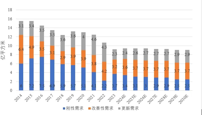 從房地產(chǎn)銷售的預測框架來看,商品房兩大屬性=居住+投資。在全面去金融化趨勢下,假設投資需求為0,則新建商品房需求=新增剛性需求(適齡購房人口+城鎮(zhèn)化率)+新增改善需求(人均居住面積)+新增更新需求(舊改、棚改)-存量房供給-新建保障性住房,人口負增長、城鎮(zhèn)化率增速放緩、人均住房面積提升帶來剛性(2.9億平方米/年)和改善需求(3.7億平方米/年)下降,但舊房更新需求(2.7億平方米/年)和新建保障性住房增加,帶來新增商品房需求逐年回落,但斜率趨緩??傮w來看,我國新型城鎮(zhèn)化仍在持續(xù)推進,房地產(chǎn)高質(zhì)量發(fā)展還有相當大的空間。