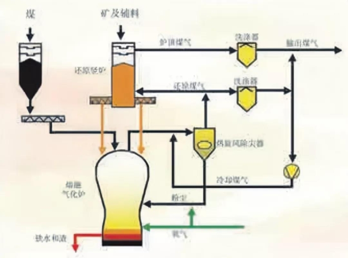 傳統(tǒng)的長流程鋼鐵冶煉生產(chǎn)為:焦化—燒結(jié)—高爐煉鐵—轉(zhuǎn)爐煉鋼—熱軋工藝,流程長,污染大,且需要大量的煉焦煤。